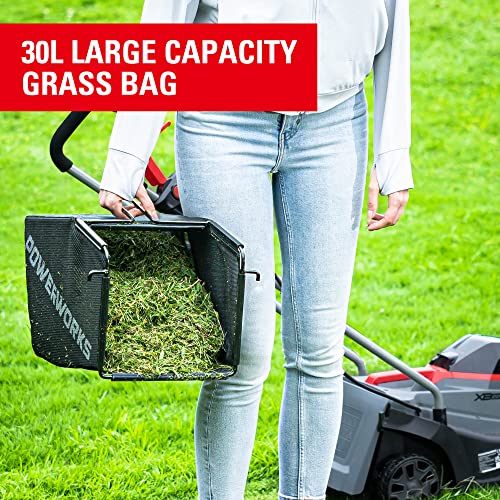 Powerworks Accugrasmaaier, 20 V Li-Ion elektrische grasmaaier, 33 cm maaibreedte, opvangbak van 30 liter, 3-traps maaihoogteverstelling (25/40/55 mm), accu en oplader inbegrepen