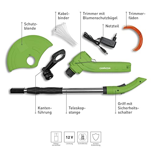 Specificaties: GARVIDA Accugrastrimmer, randsnijder met kabelbinders en trimmerdraden als snijgereedschap, steek- en draaisysteem, geheel zonder gereedschap, randgeleiding en in hoogte verstelbare handgreep, groen