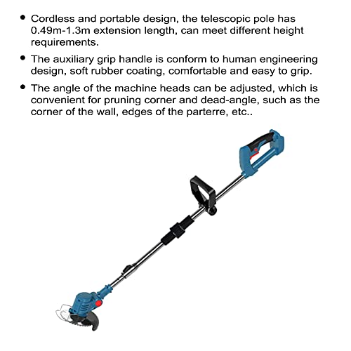 Dit is een soort hoogwaardige elektrische grasmaaier, draadloos en draagbaar ontwerp, de telescoopstang heeft een uittreklengte van 0,49 m tot 1,3 m en kan aan verschillende hoogteeisen voldoen. Brede toepassingsmogelijkheden, geschikt voor het snoeien van binnenplaatsen, weidegras, parken, villa’s, kleine struiken enz. Probeer het uit.